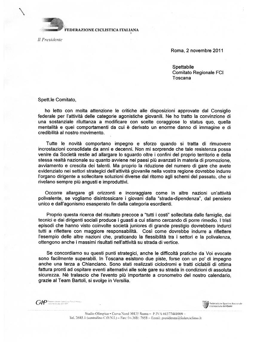 Il presidente della Federciclismo Renato Di Rocco risponde alle societa' toscane che dopo una accesa riunione svoltasi a Cintolese (PT) avevano sollecitato il Comitato Regionale Toscano a chiedere una modifica alla decisione presa in base alla quale la seconda domenica dei mesi di Aprile - Maggio - Giugno e Luglio non sara' possibile organizzare le tradizionali gare per le categorie Esordienti - Allievi e Juniores ma solo manifestazioni alternative fra cui gare su pista , tipo pista e MTB per Esordienti mentre per allievi e juniores possono essere effettuate anche gare a frazioni.