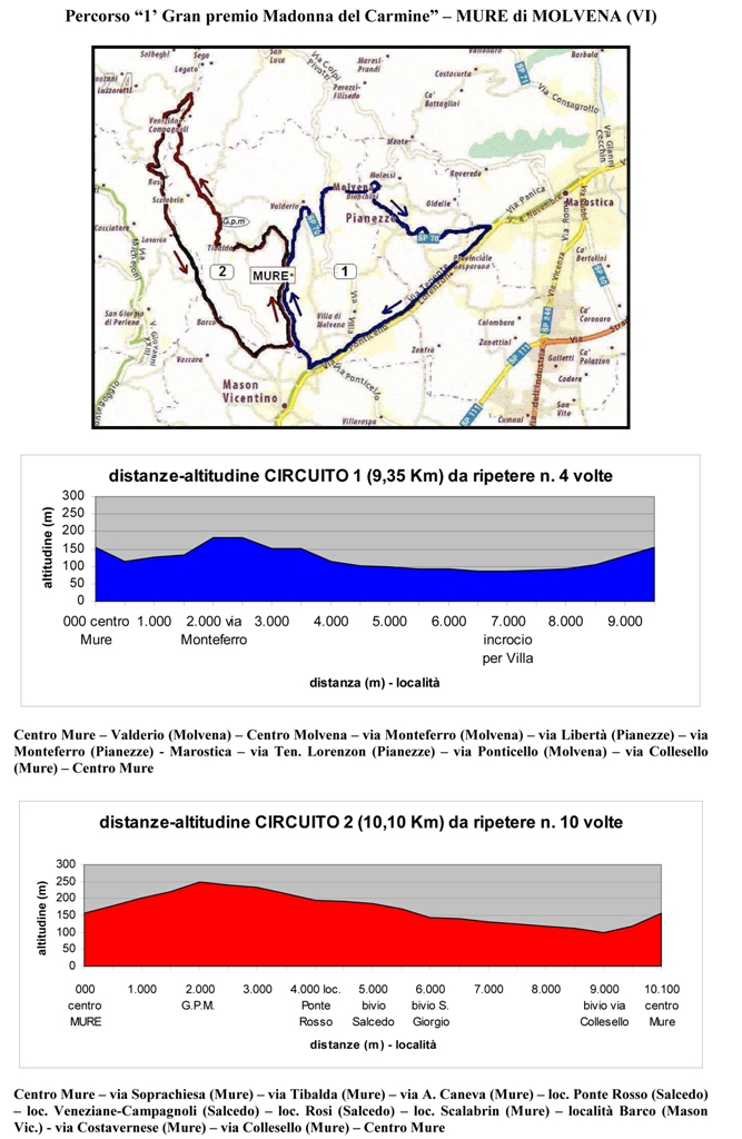 Il percorso prevede un primo circuito da ripetersi 4 volte di 9,450 km (Mure-Molvena-Pianezza -Marostica-Mure), seguito da un secondo circuito di 10,100 km da ripetersi per 10 volte (Mure-Laverda-Mason e Mure) per un totale di 140 km, idoneo ai corridori definiti in gergo ciclistico: "passisti-scalatori". Grande importanza verra' data alla sicurezza dei concorrenti, e' stato confermato agli incroci il presidio di ben oltre 60 volontari della Protezione Civile di Colceresa, dell'Unione dei Comunidi Marostica e di Fara Vicentina. Ad oggi, un centinaio sono gli iscritti che si contenderanno la vittoria di questo prima edizione, non resta che aspettare chi sara' il concorrente che tagliera' per primo il traguardo.
